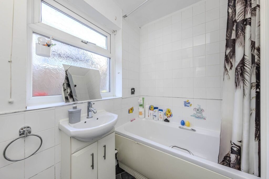 Upstairs, you will find two generously sized bedrooms, both of which are tastefully decorated and offer plenty of storage space. The family bathroom, featuring a bath with overhead shower, WC, and wash basin.