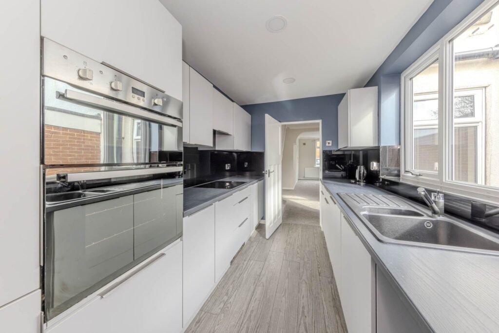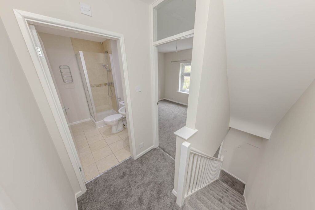 Upstairs, the property comprises two well-proportioned bedrooms, each benefiting from generous natural light and neutral tones, creating a calm and restful atmosphere. Theres a first floor shower room, fitted with modern sanitary ware and stylish tiling, providing a private retreat. The second bedroom is equally spacious, ideal for guests, a home office, or a nursery.