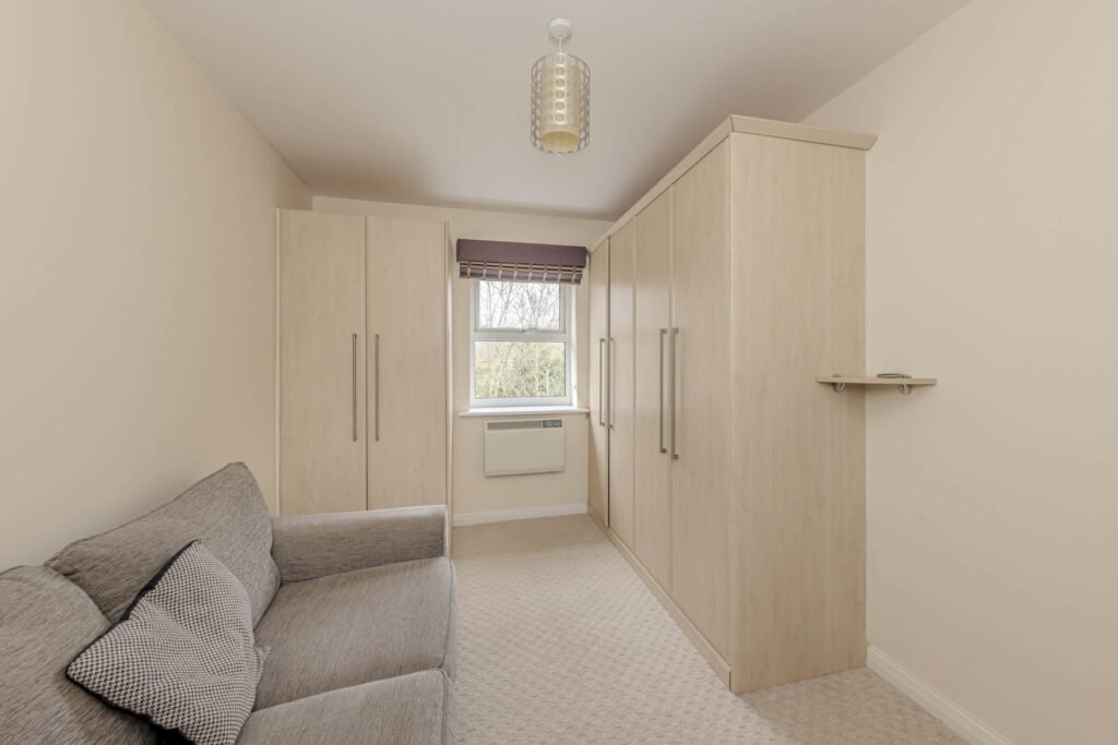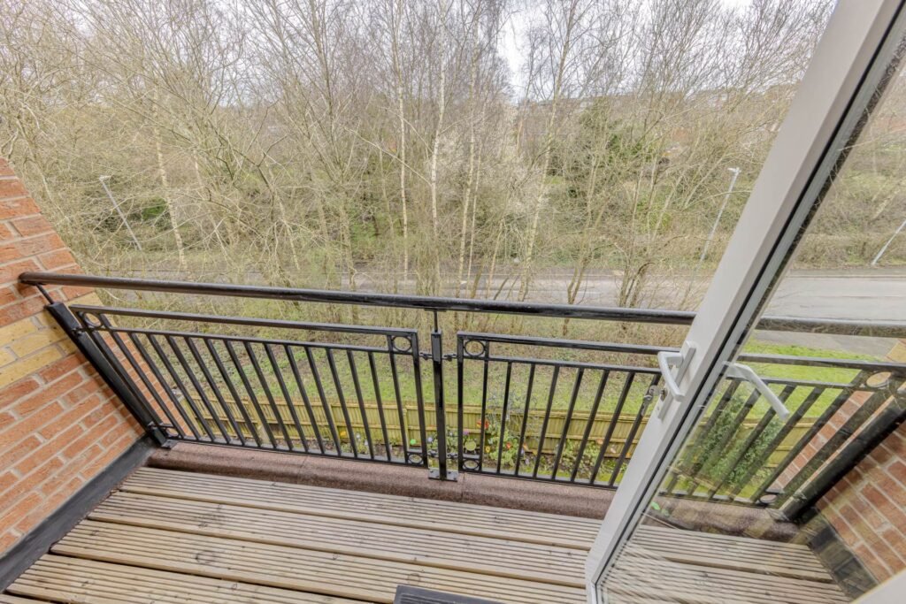 Upon entering, you are welcomed into a bright and airy reception room, perfect for relaxing or entertaining guests. The room benefits from a Juliet balcony, allowing natural light to flood in and providing a pleasant view of the surrounding area. The space is versatile, offering ample room for both seating and dining arrangements.