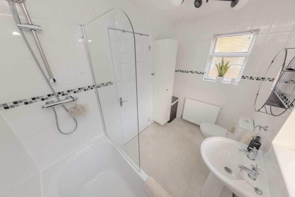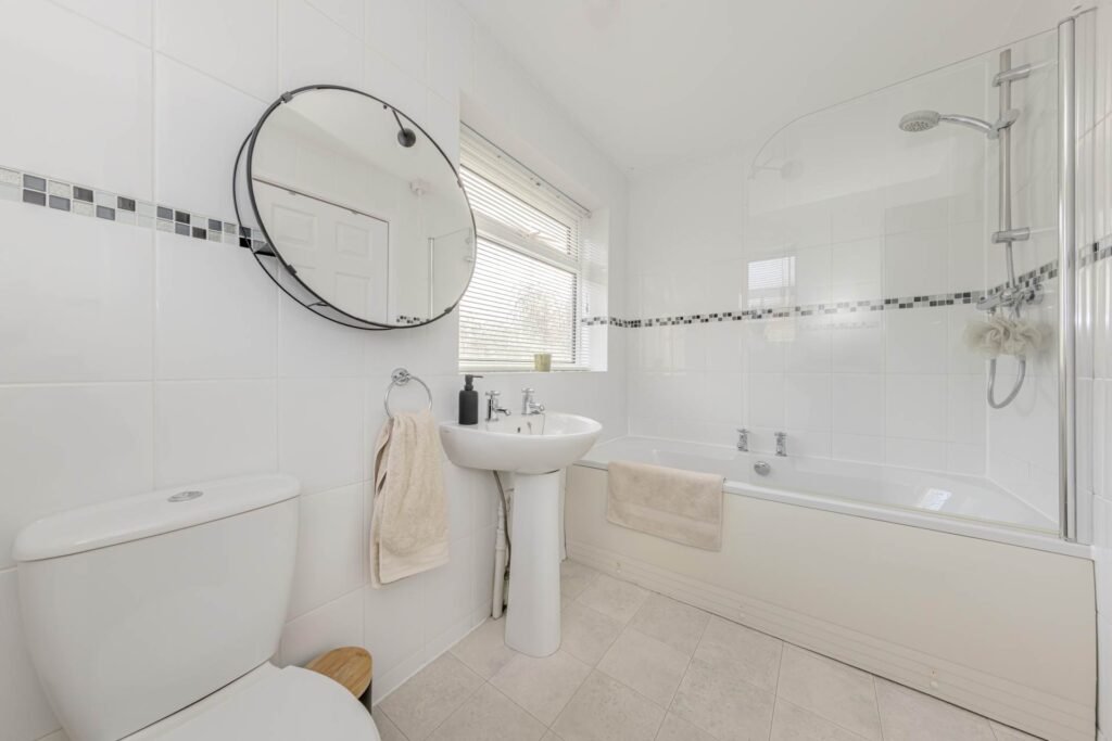 Upstairs, the property boasts three good-sized bedrooms, each offering comfortable accommodation with plenty of natural light. These rooms provide flexibility for a growing family, home office, or guest space. The bathroom is well-appointed with a modern suite, including a bath with shower over, wash basin, and WC, finished in neutral tones for a fresh and clean feel.