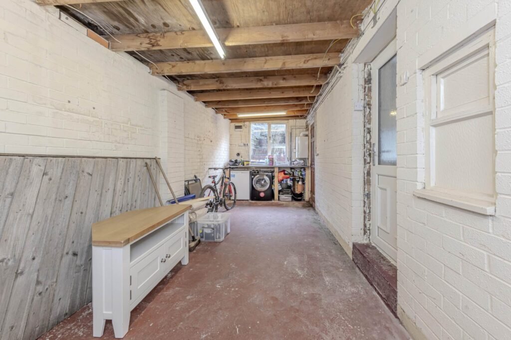 Adjacent to the reception room is the kitchen, equipped with ample work surfaces and storage units, designed to meet the needs of everyday cooking and meal preparation. There is plenty of room for essential appliances, and the layout encourages a practical flow between cooking and dining areas.
