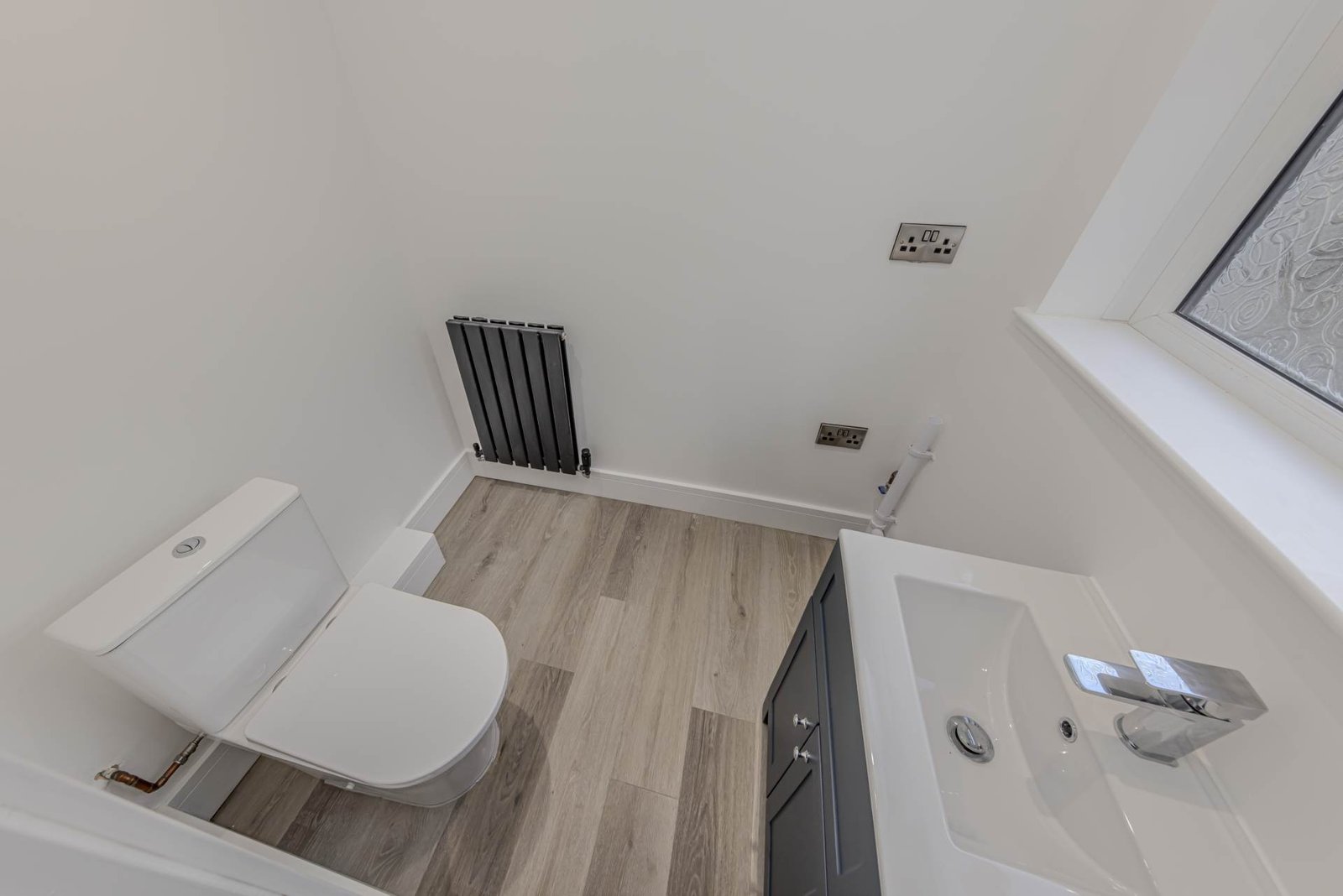 The kitchen is fitted with a range of units and work surfaces, providing plenty of storage and preparation space. Adjacent to the kitchen is a convenient downstairs WC, a practical addition for busy households and visitors alike. From the kitchen, a door leads out to the rear courtyard, a private outdoor space ideal for enjoying a morning coffee or evening unwind. The courtyard is low maintenance, offering a secure and cosy area for outdoor seating or potted plants.