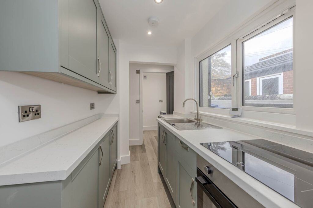The kitchen is fitted with a range of units and work surfaces, providing plenty of storage and preparation space. Adjacent to the kitchen is a convenient downstairs WC, a practical addition for busy households and visitors alike. From the kitchen, a door leads out to the rear courtyard, a private outdoor space ideal for enjoying a morning coffee or evening unwind. The courtyard is low maintenance, offering a secure and cosy area for outdoor seating or potted plants.