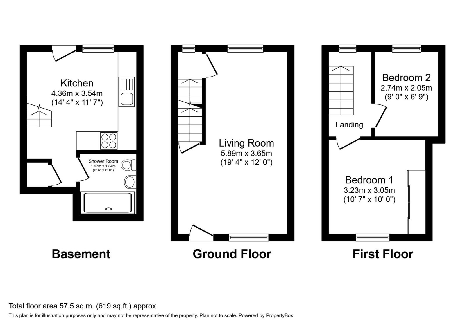 Stairs rise from the lounge to first floor landing and lower ground floor