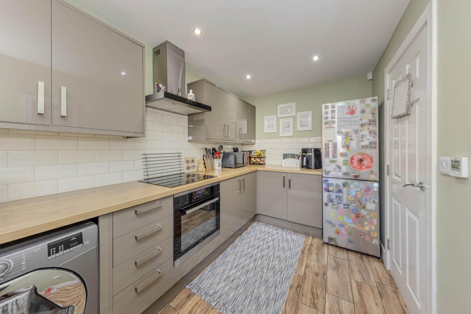 The kitchen, located on the ground floor, is thoughtfully designed with ample storage and work surfaces, catering to the needs of a modern household. Adjacent to the kitchen, the dining area offers a comfortable space for family meals, with direct access to the garden, allowing for seamless indoor-outdoor living during warmer months.