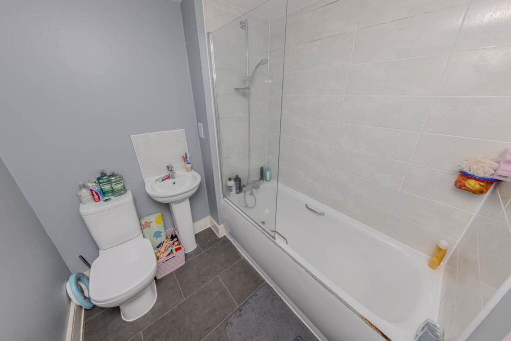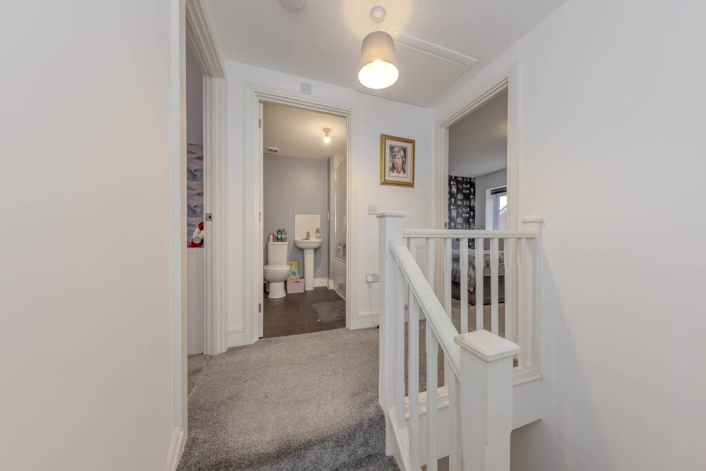 Upstairs, the property comprises two well-proportioned bedrooms, each offering plenty of space for rest and relaxation. Both rooms benefit from good natural light and neutral tones, allowing new owners to personalise the space with ease. The bathroom is tastefully finished with modern sanitary ware, including a bath with an overhead shower, a wash basin, and a WC, all presented to a high standard.