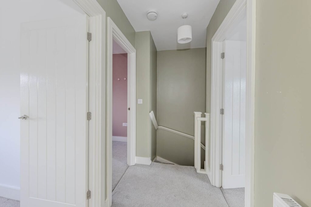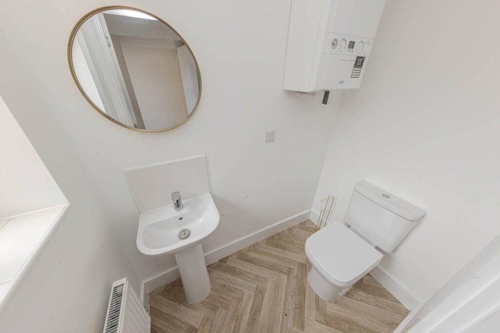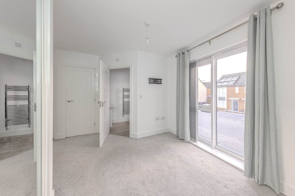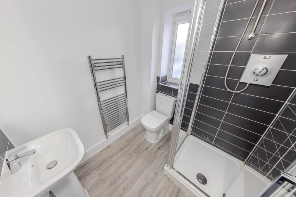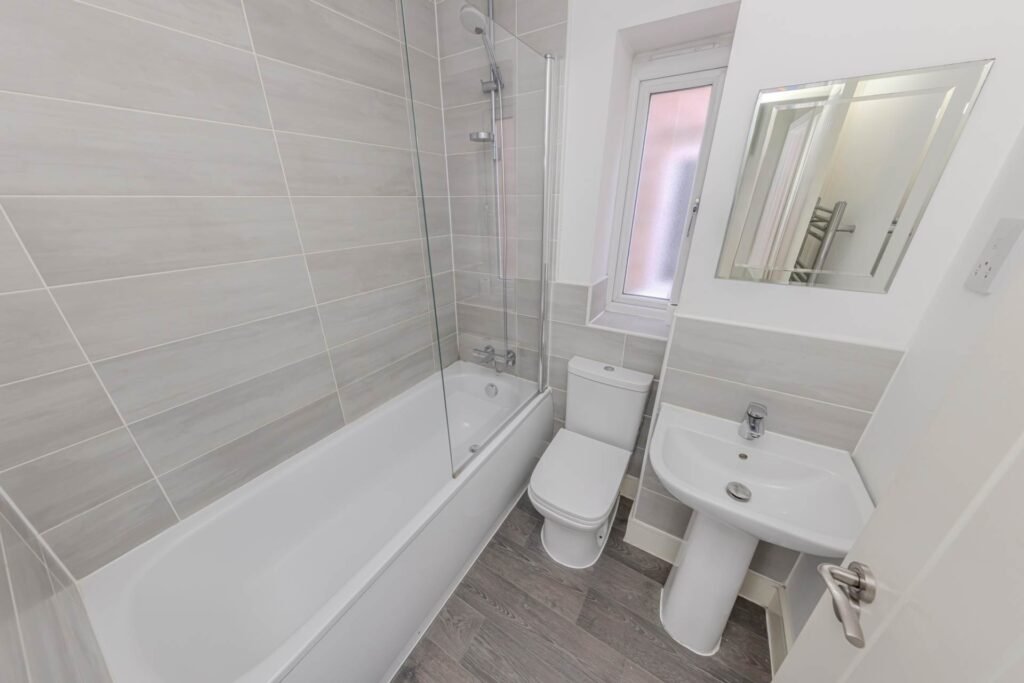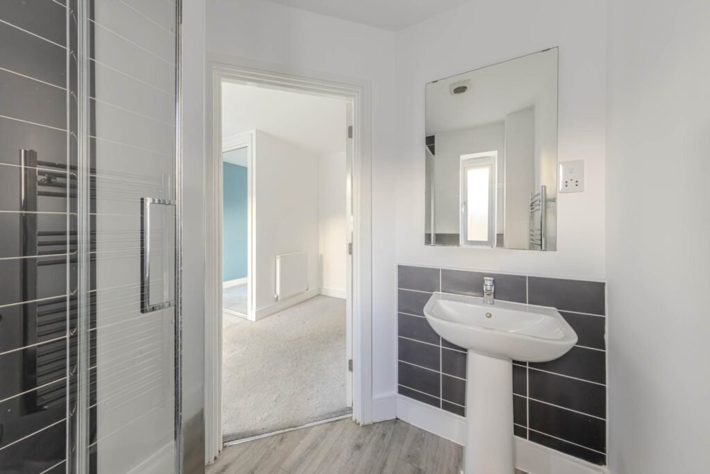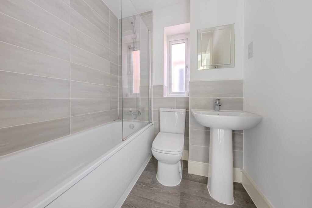 Upstairs, the property offers three generously sized bedrooms. The master bedroom benefits from a contemporary en-suite bathroom, fitted with a sleek shower cubicle, wash basin, and WC, providing a private retreat for the homeowners. The remaining two bedrooms are equally well-proportioned, suitable for children, guests, or as a home office. A family bathroom, complete with a bath, overhead shower, wash basin, and WC, serves these rooms and is finished to a high standard.