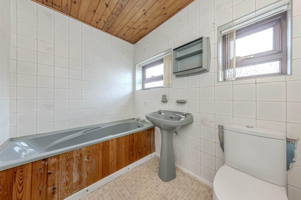 Upstairs, you will find two well-proportioned bedrooms, offering ample space for a growing family or those in need of a home office. The bathroom is conveniently located on this floor, featuring a bath with shower over, wash basin, and WC.