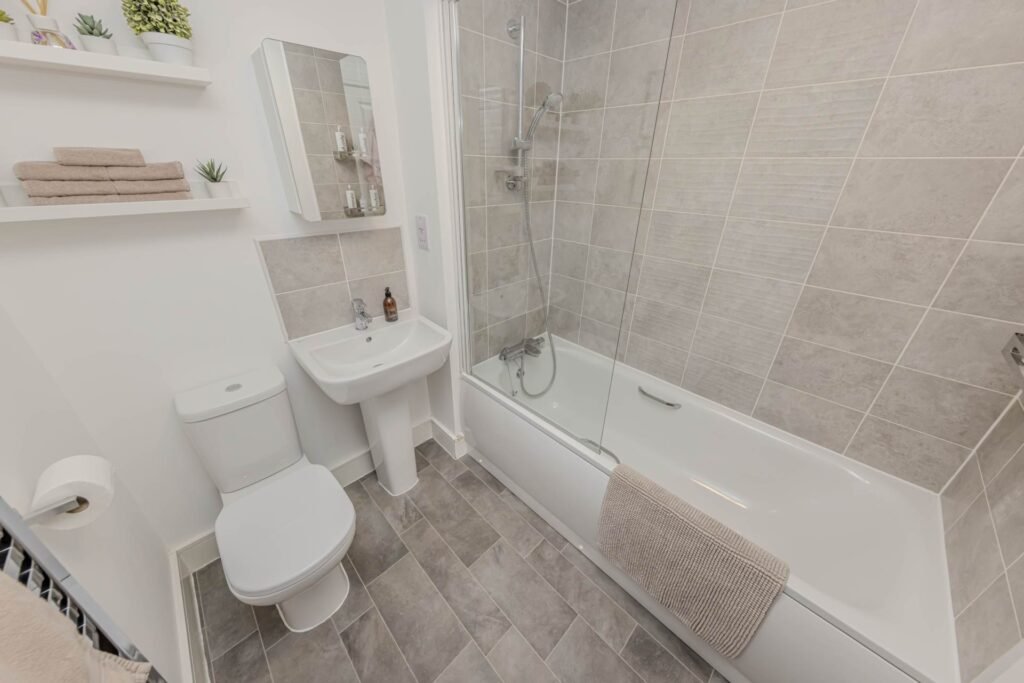 The bathroom is sleek and stylish, featuring a bathtub and shower combination, as well as a vanity unit with storage space. The neutral colour scheme and modern fixtures create a spa-like atmosphere, perfect for unwinding after a long day.