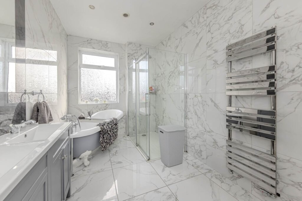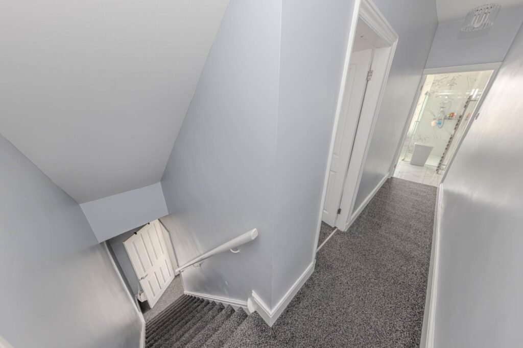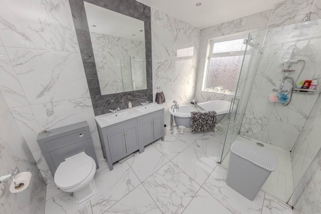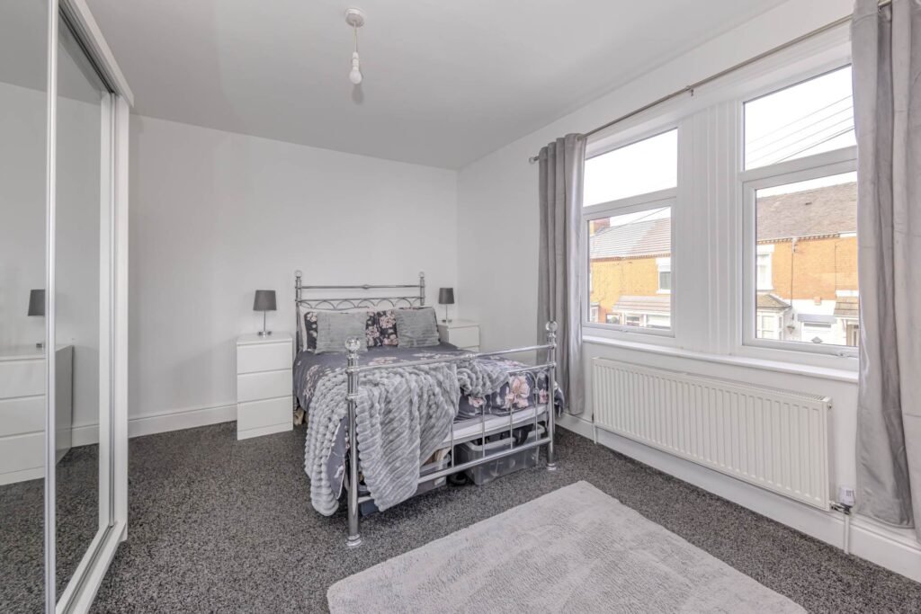 Upstairs, you will find two generous double bedrooms, each offering plenty of natural light and space for wardrobes and additional furniture. The large, modern bathroom serves the property well, featuring a sleek suite including a bath and walk-in shower, wash basin, and WC, all finished to a high standard.