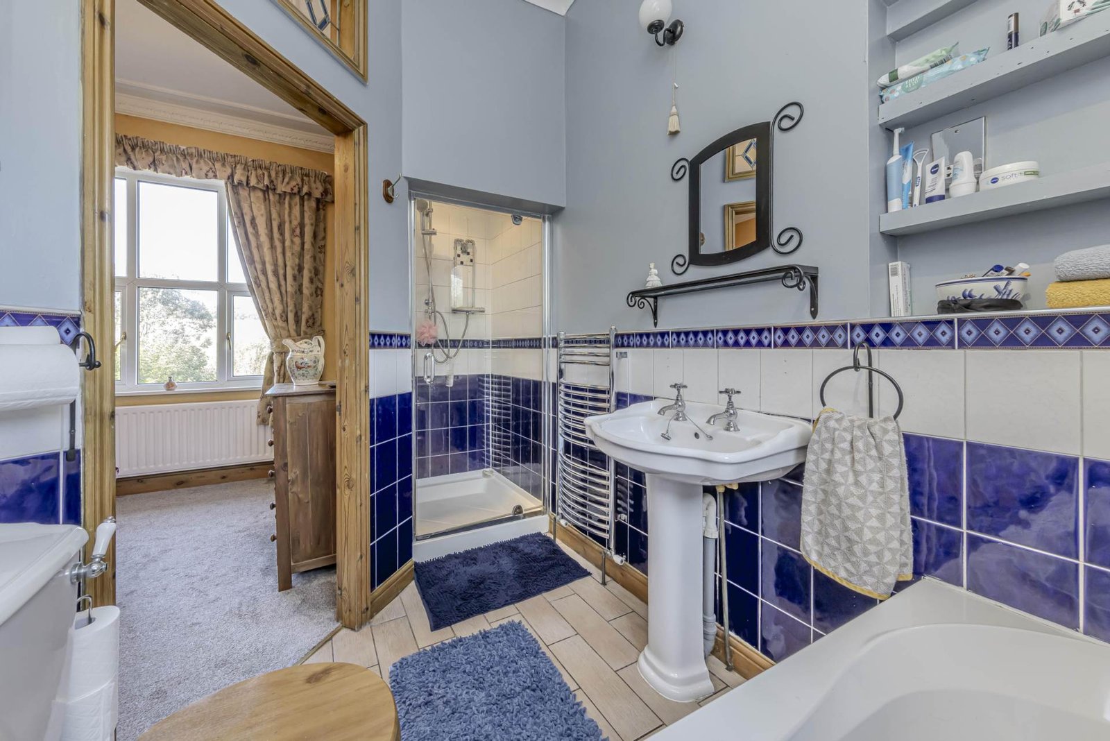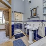 Heading upstairs, you will find two well-proportioned bedrooms, both offering plenty of natural light from the dual aspect windows. The first floor bathroom is sleek and modern, featuring a panel bath, central chrome mixer taps and shower attachment, with a separate walk in tiled shower cubicle, chrome ladder style heated towel rail, ceramic tiled floor with under floor heating, and pedestal wash hand basin, low level WC.