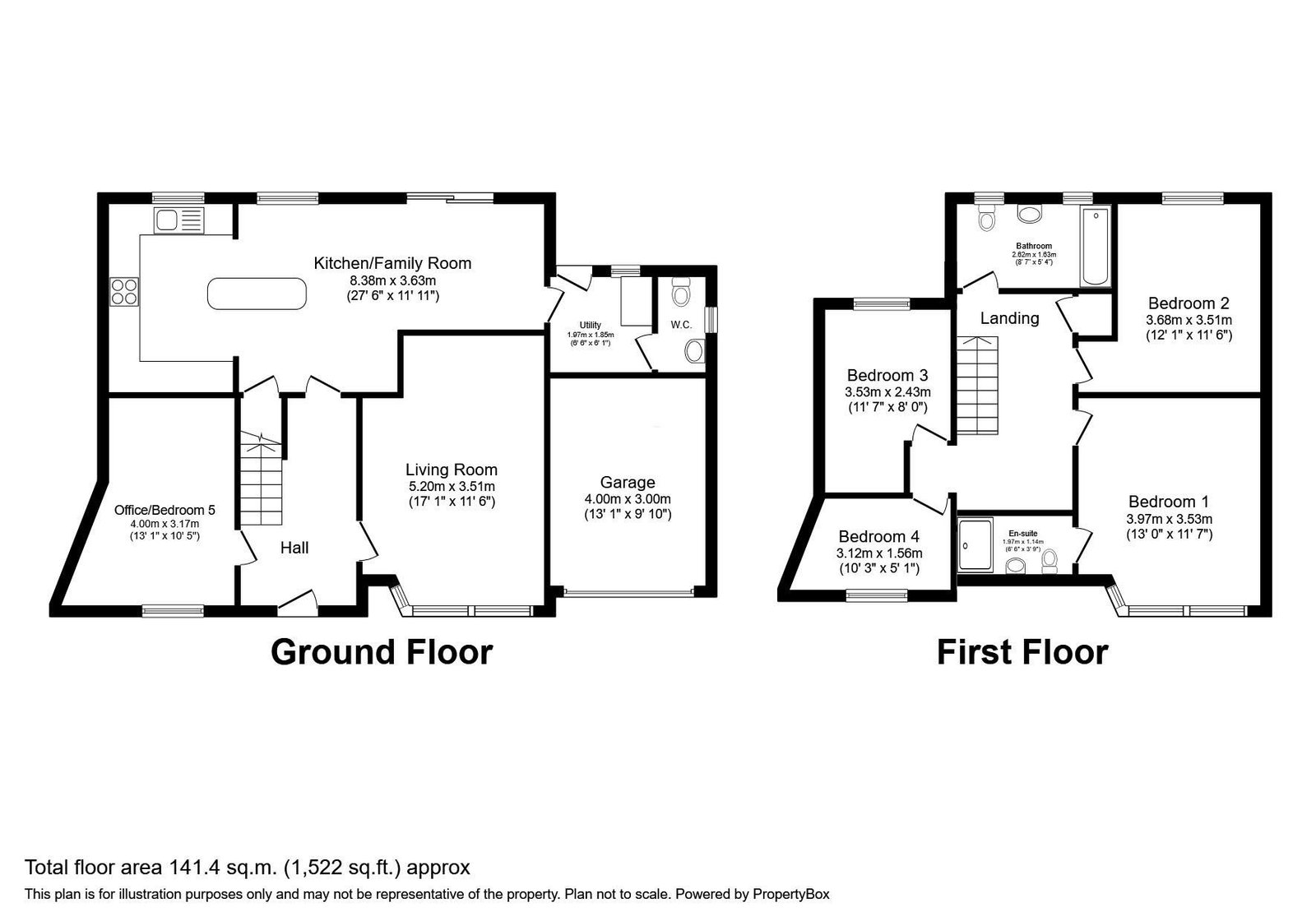 Upstairs, the property has four spacious bedrooms, each with plenty of built-in storage space. Two of the bedrooms share one of the two family bathrooms, while the master bedroom boasts its own en-suite bathroom. The property has double glazing throughout, ensuring a quiet and peaceful living environment.