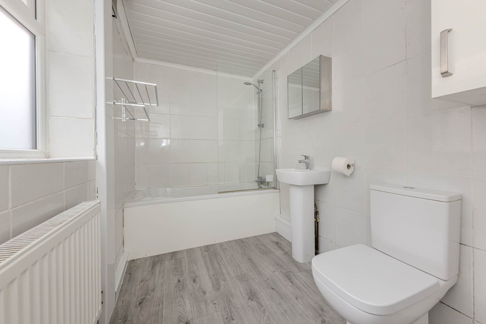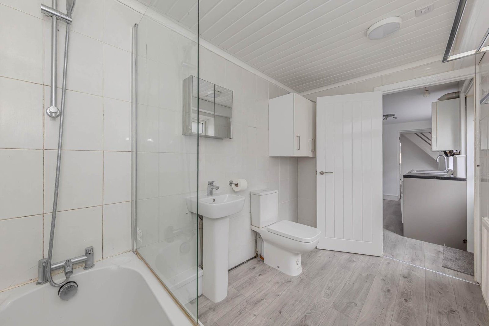 The galley kitchen is practical and efficient, fitted with a range of units and work surfaces, providing plenty of storage and preparation space. It benefits from natural light and offers direct access to the rear yard, ideal for outdoor seating or gardening. Upstairs, you will find two well-proportioned bedrooms, both featuring double glazing that ensures a peaceful environment and excellent insulation. The bathroom is neatly presented and includes a modern suite with a bath and overhead shower, complemented by contemporary tiling.