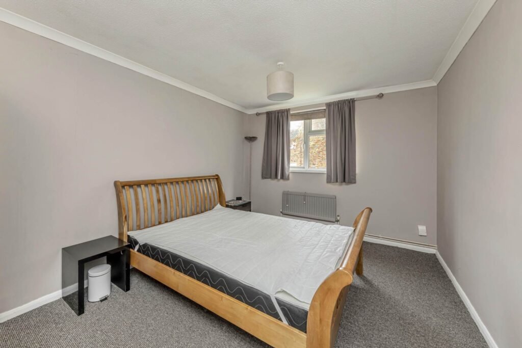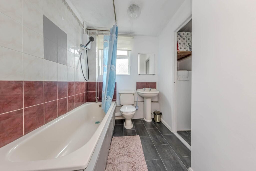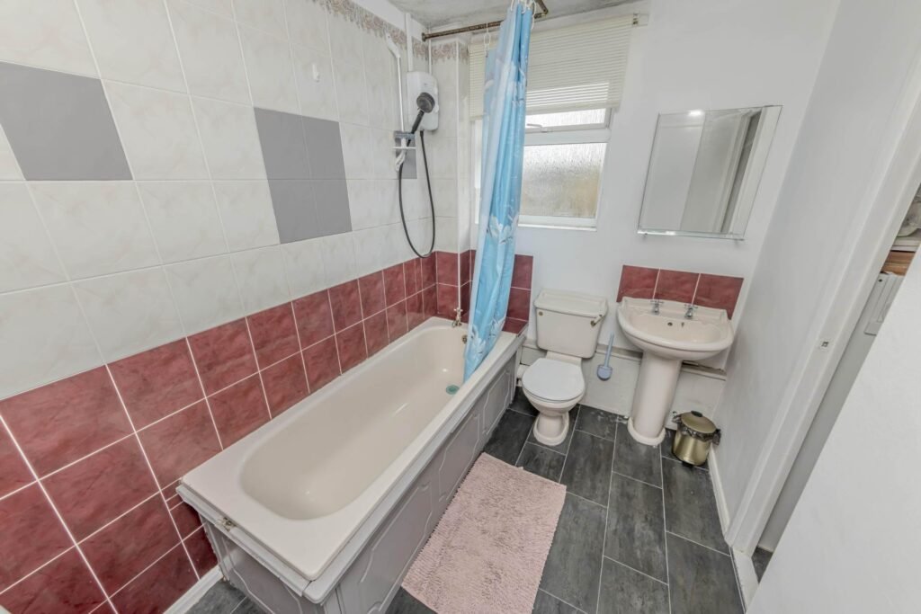 The bedroom is generously sized and offers ample storage space for all your belongings. The modern bathroom features a white suite with a bath and shower overhead, perfect for unwinding after a busy day.