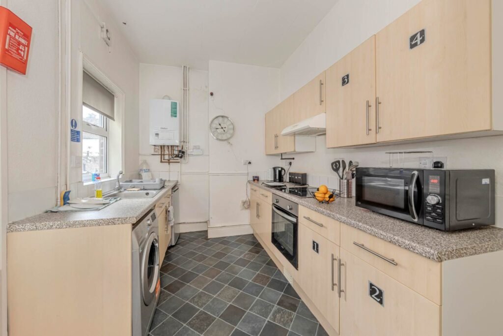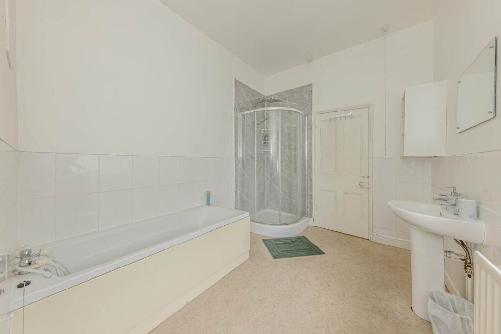 The kitchen, situated adjacent to the rear reception, is fitted with a range of units providing good storage and work surface space, ideal for preparing meals. From here, a door opens out to the private garden, a delightful outdoor space that is low maintenance yet perfect for enjoying a morning coffee or hosting summer barbecues.