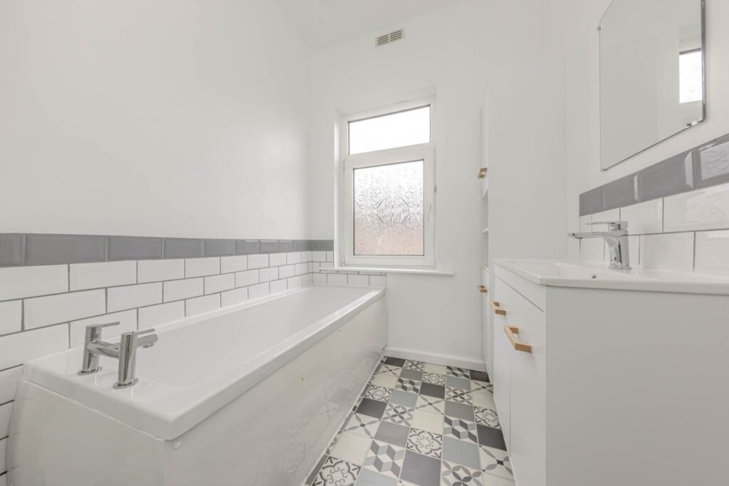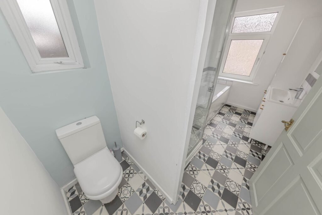 Upstairs, you will find two well-appointed bedrooms, both offering plenty of space and storage options. The bathroom is sleek and stylish, featuring a bath with overhead shower, WC, and washbasin.