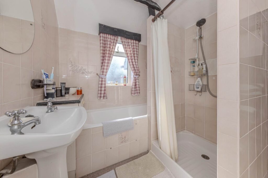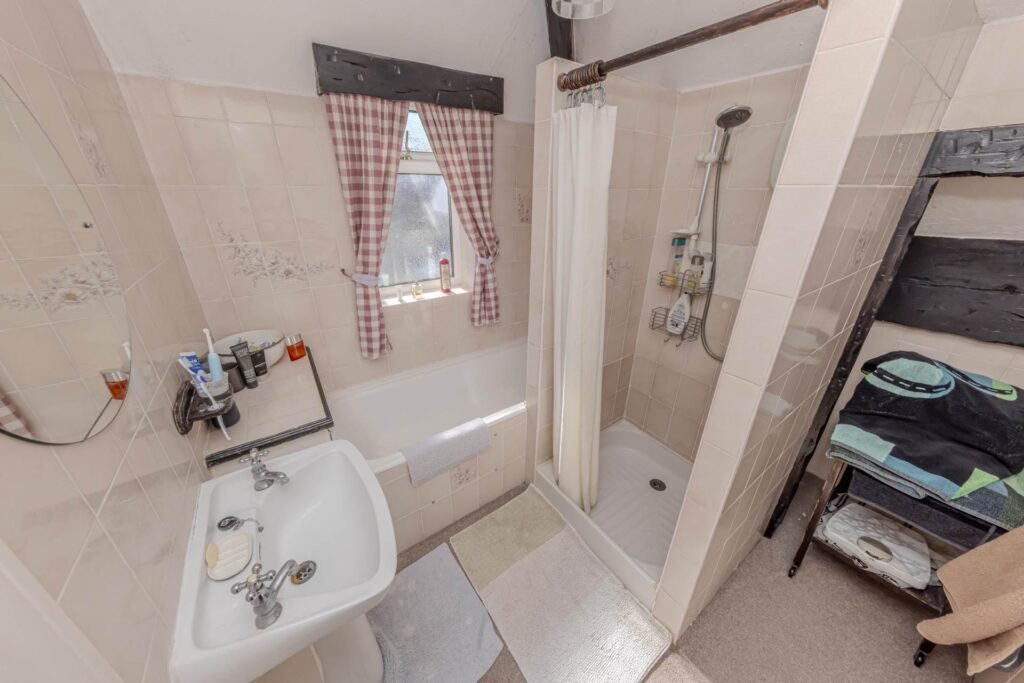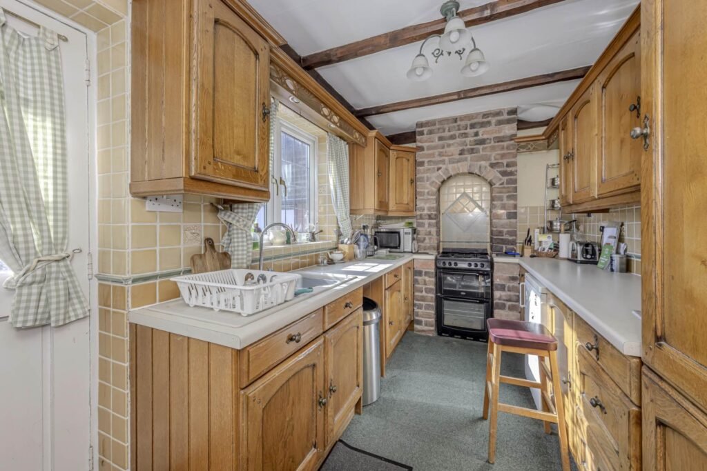 The accommodation is well-proportioned and comprises three bedrooms, a bathroom, two reception rooms, and a kitchen. The two reception rooms provide versatile living space, ideal for both relaxing and entertaining. The kitchen, while in need of updating, offers ample room for cooking and dining, with potential to extend or reconfigure to suit modern living requirements.