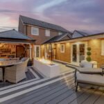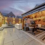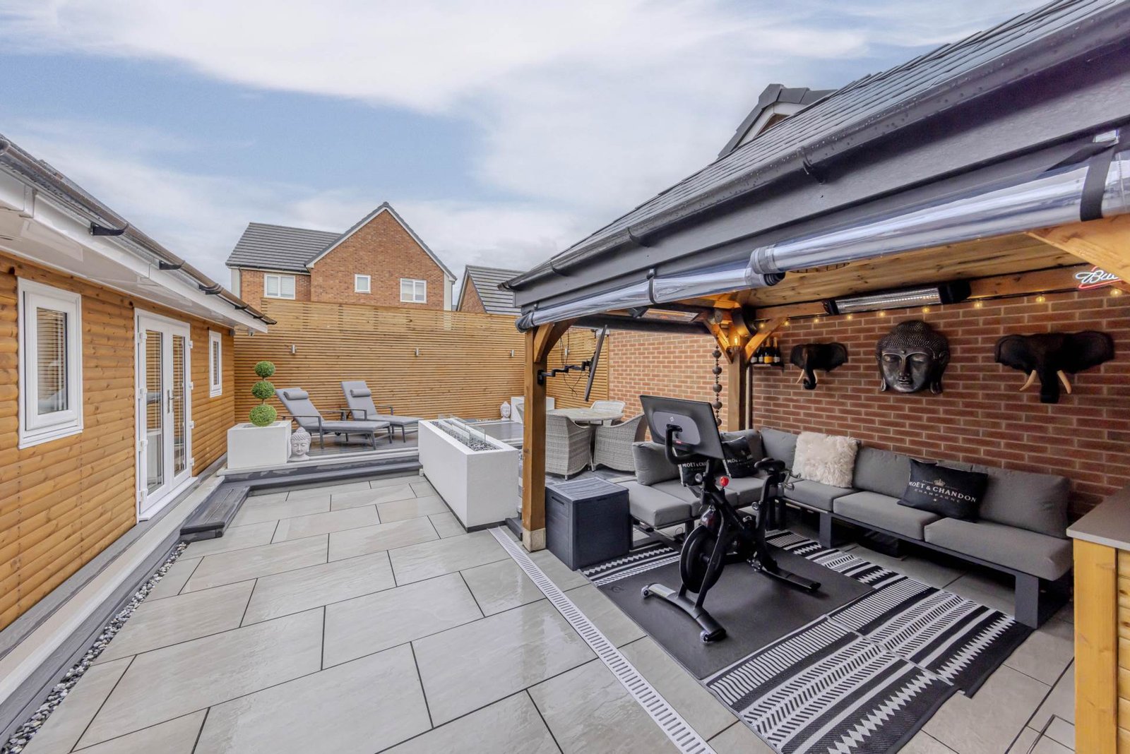 Step outside into the stunning landscaped garden, complete with a workshop and a bar/gym area that looks truly magical at night. The perfect spot for hosting summer BBQs or enjoying a quiet evening under the stars. Parking for two cars is also available, providing added convenience for homeowners.