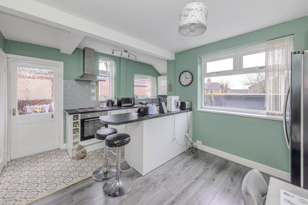 Upon entering, you are welcomed into a bright and inviting reception room, which provides a cosy yet spacious environment for relaxing or entertaining guests. The neutral décor and large window allow natural light to flood the space, creating a warm and welcoming atmosphere. The room flows seamlessly into the open-plan kitchen diner, a real highlight of the property. This modern kitchen is well-equipped with ample storage and work surfaces, perfect for preparing meals and hosting family dinners. The dining area comfortably accommodates a table and chairs, making it a sociable space to enjoy everyday meals or entertain friends.