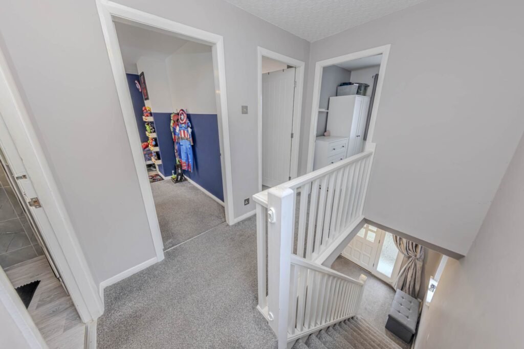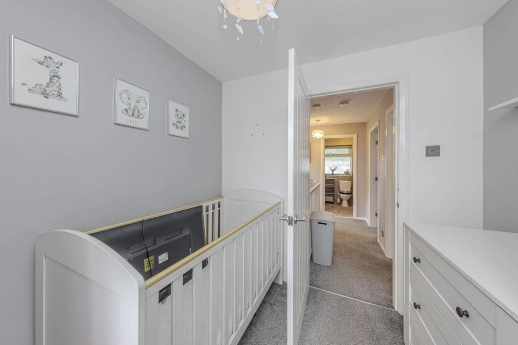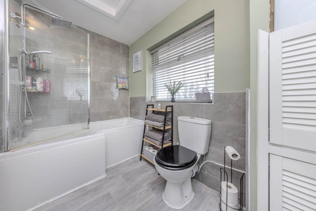 Upstairs, you will find three well-proportioned bedrooms, all flooded with natural light. The family bathroom is stylishly tiled and features a bath with overhead shower, wash basin, and WC.