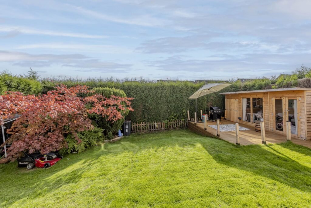 Outside, the private rear garden is a peaceful retreat, with a summerhouse providing a lovely spot to enjoy the outdoors. The garage and parking for four cars ensure that there is plenty of space for vehicles.